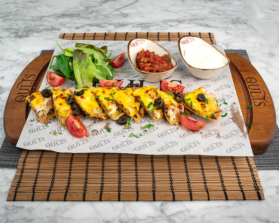 Mısır tortillası üzerine tavuk parçaları, Jalapeno biberi, eritilmiş kaşar, cheddar peyniri ve özel sosları ile birlikte