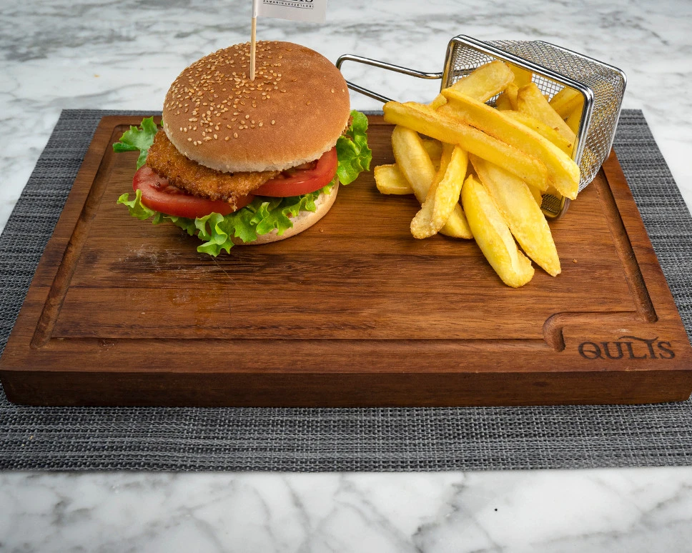 Panelenmiş tavuk göğsü, turşu, domates, marul, patates tava ve chili mayo sos ile