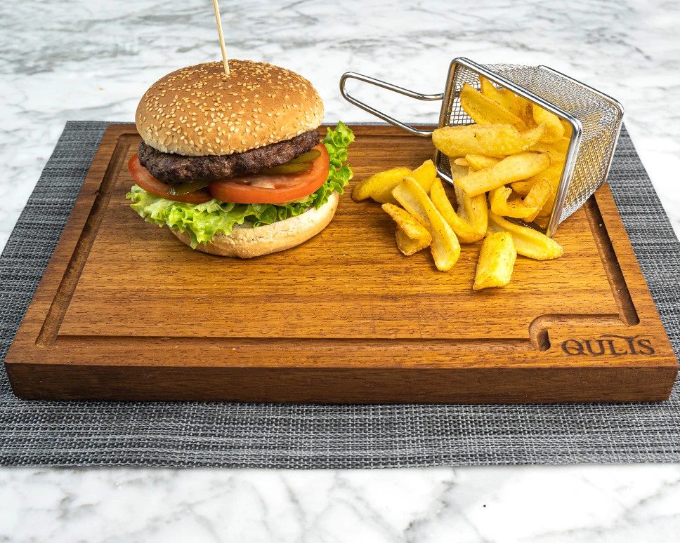 Özel ev yapımı burger köftesi,domates,marul,turşu, patataes tava ve chili mayo sos ile