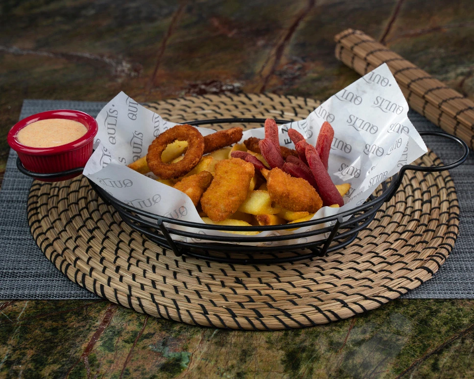 Nuggets, soğan halkası, sosis tava ve patates tava ile