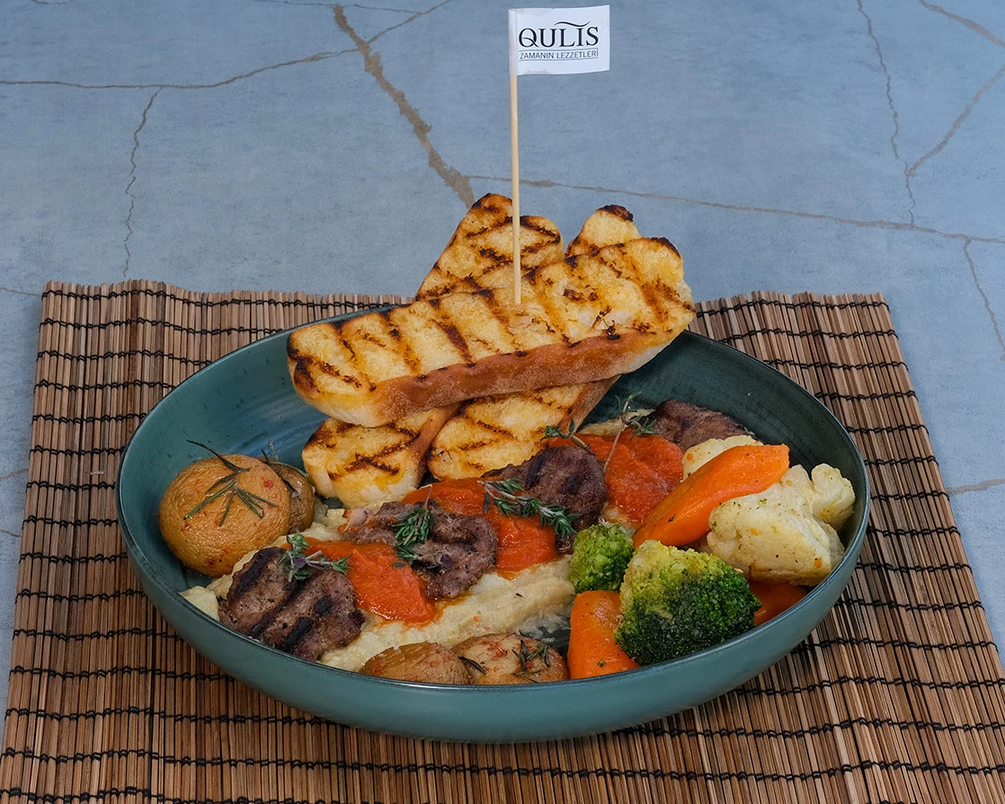 Kaşarlı Patlıcan Beğendi yatağında ev yapımı köfteler,domates sos, kızarmış ekmek,sebze sote ve mantar ile