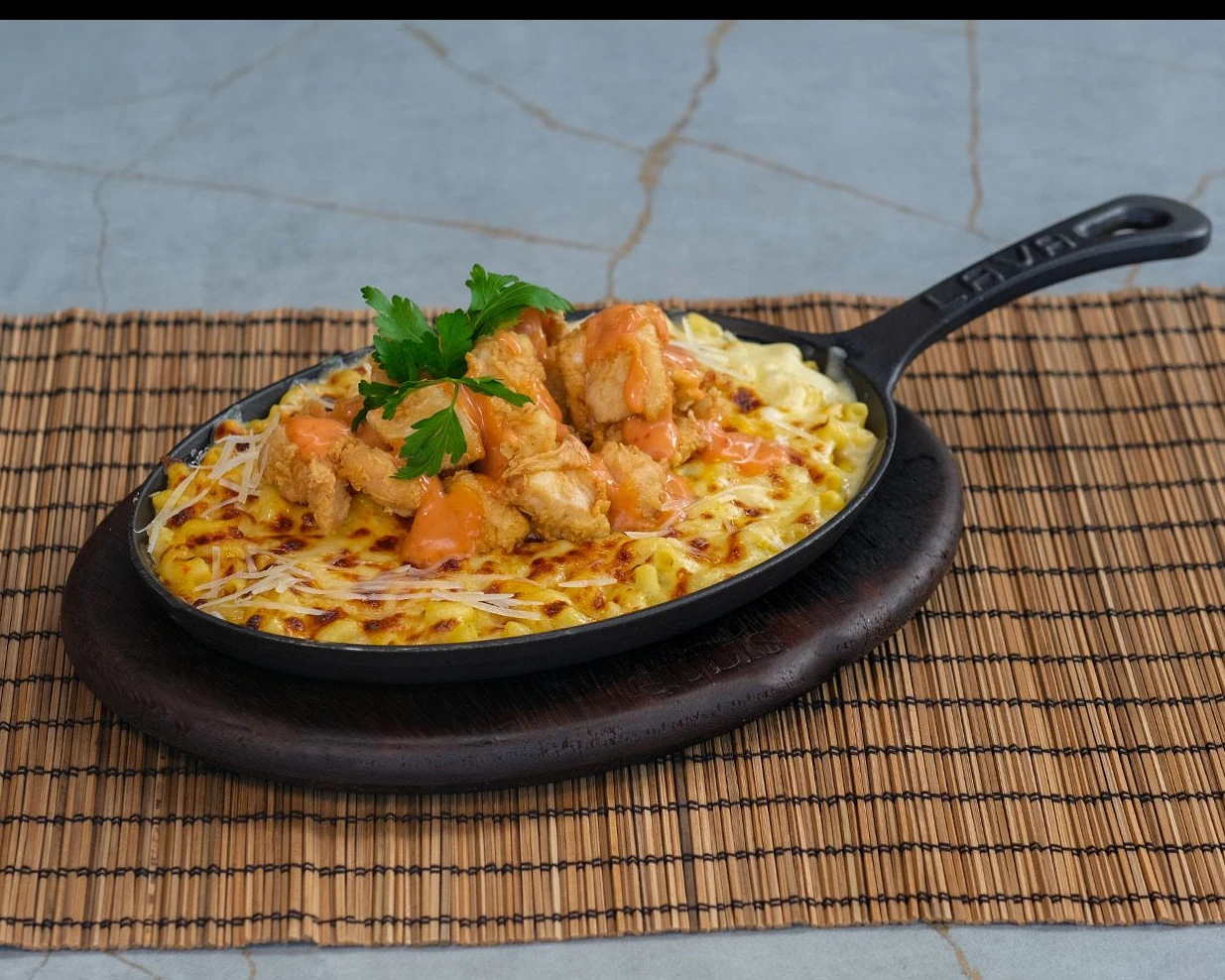 Özel Mac’n cheese soslu bukle makarna, chili mayo soslu tavuk parçaları ile,