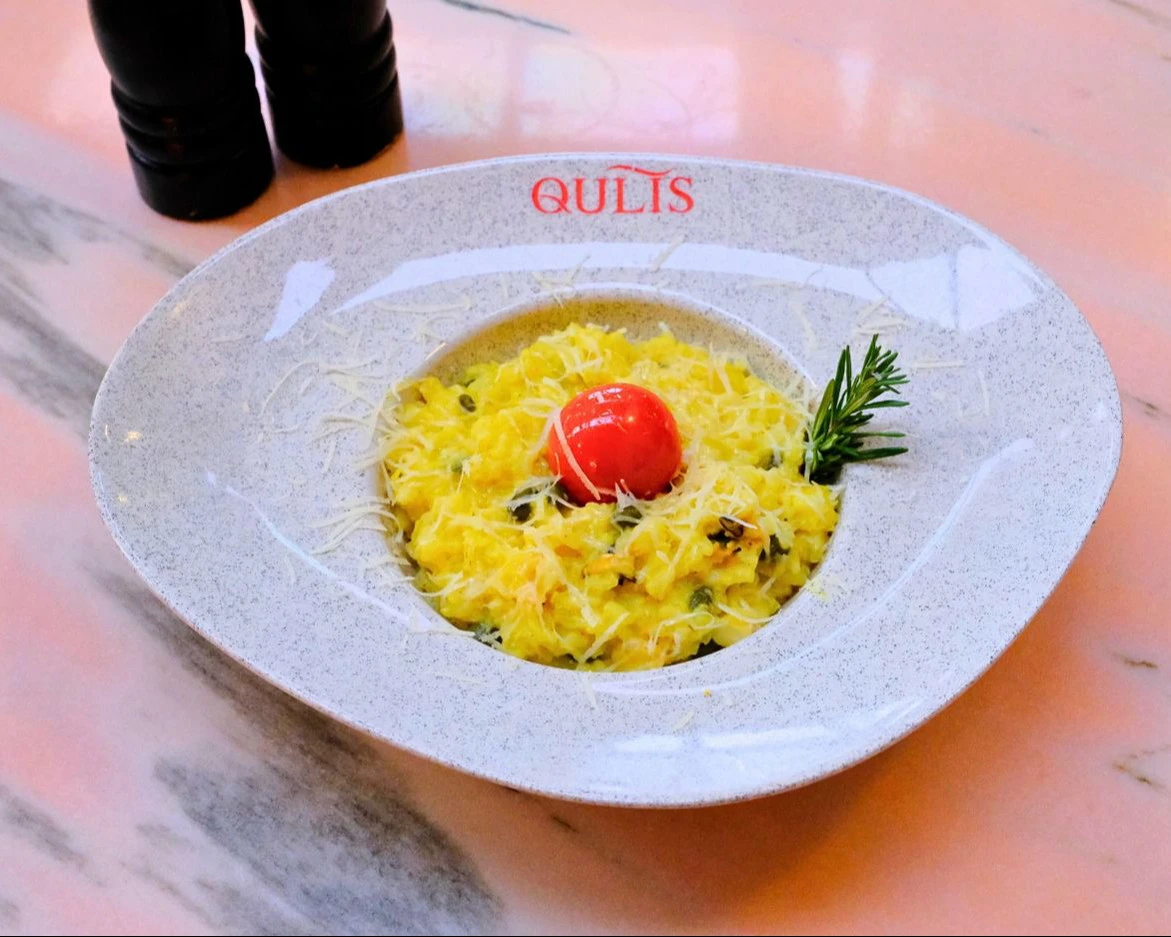 Arborio pirinci, kalamar, karides, midye içi, limon kabuğu, dereotu, kapari çekirdeği, parmesan peyniri ve safran ile