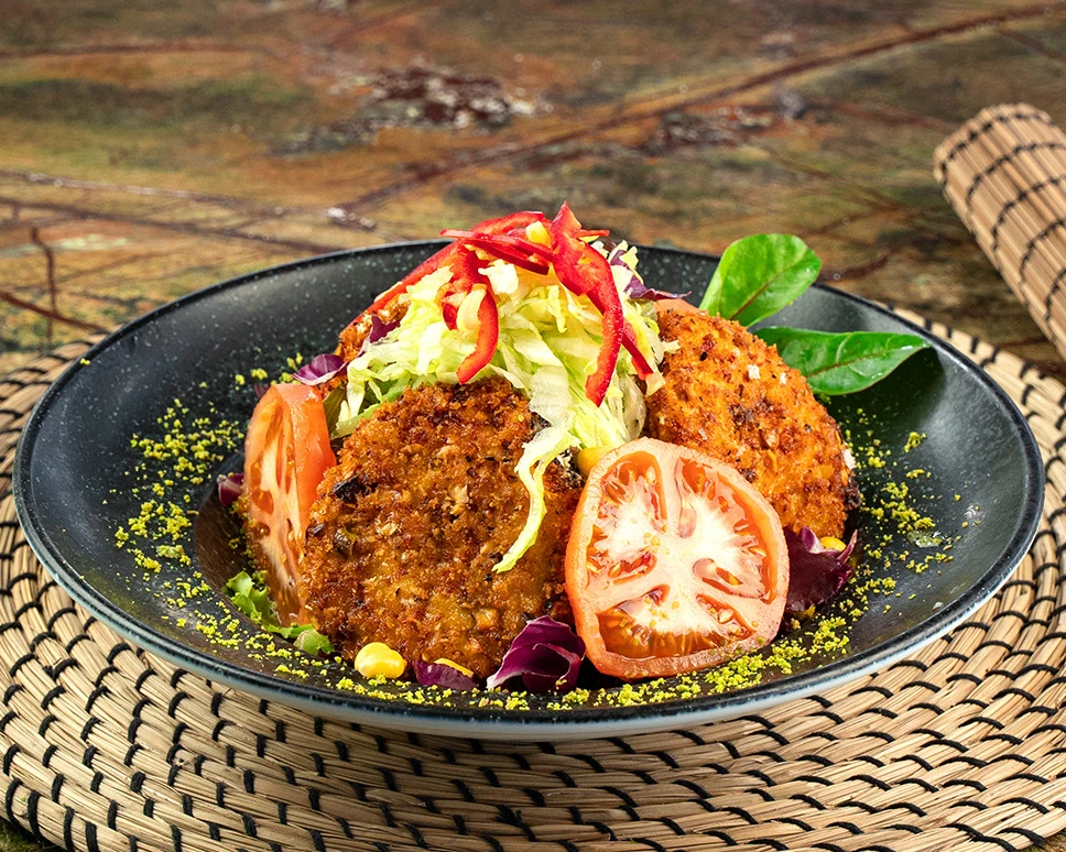 Panelenip kızartılmış Antep fıstıklı keçi peyniri, Akdeniz Yeşillikleri, Kapya Biber, Mısır, Domates, Roka ve Nar ekşili sos ile
