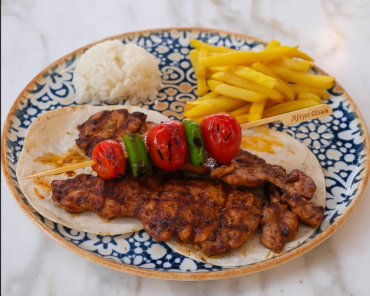 Izgara kemiksiz piliç but, parmak patates ve pirinç pilavı,ızgara domates,biber ve tortilla ekmeği sunumu ile