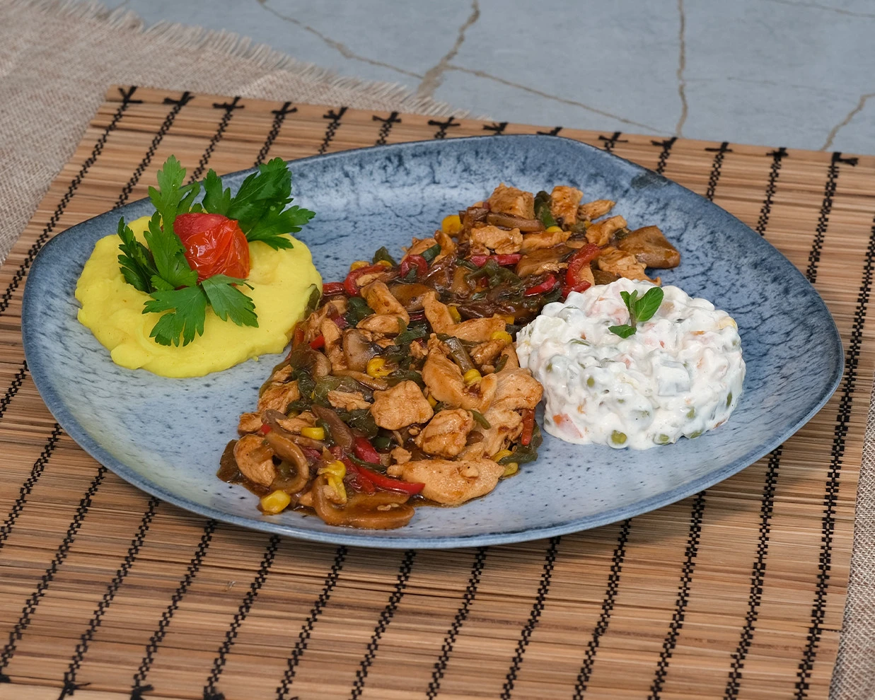 Jülyen Doğranmış Tavuk Parçaları sote edilmiş renkli Biberler, Mantar ,Soğan,kornişon turşu,tane mısır,krema,demi glace sos, rus salatası ve patates püresi ile..