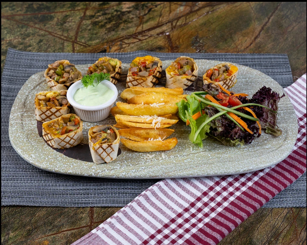 Bonfile dilimleri, Renkli biberler, Karamelize soğan, mantar, Avokado, kaşık Patates ve Akdeniz yeşillikleri özel sos ile…