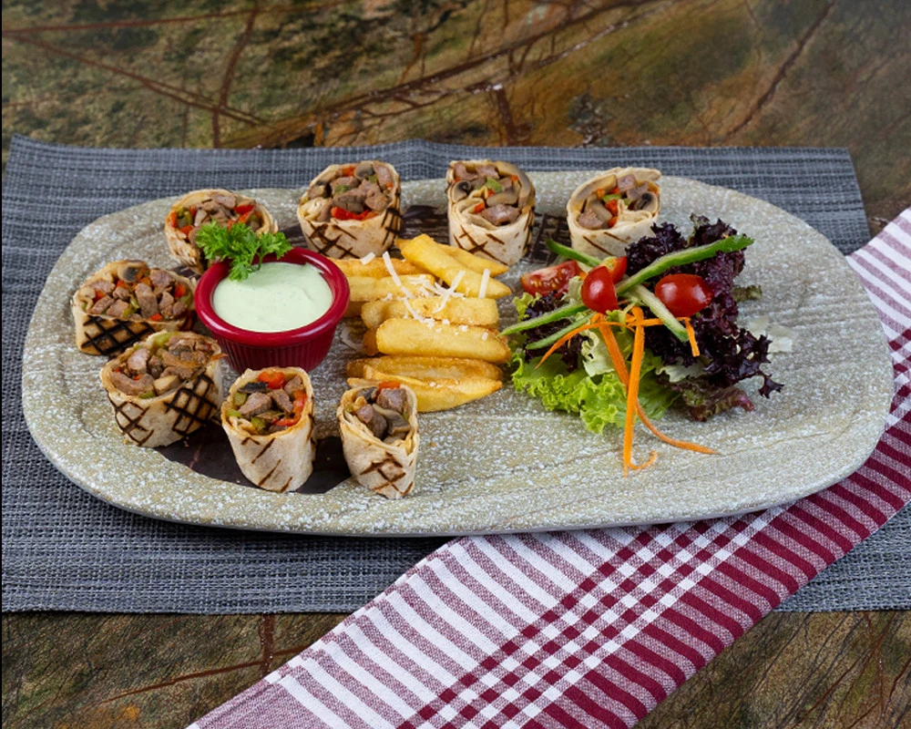 Bonfile dilimleri, renkli biberler, mantar, karamelize soğan, kaşık patates, akdeniz yeşillikleri ve ozel sos ile….